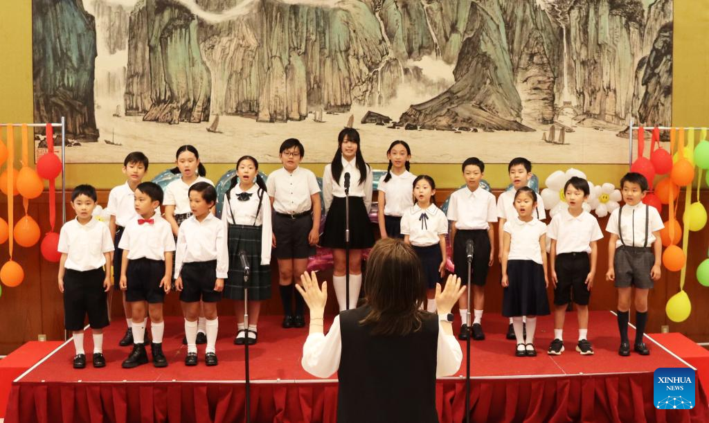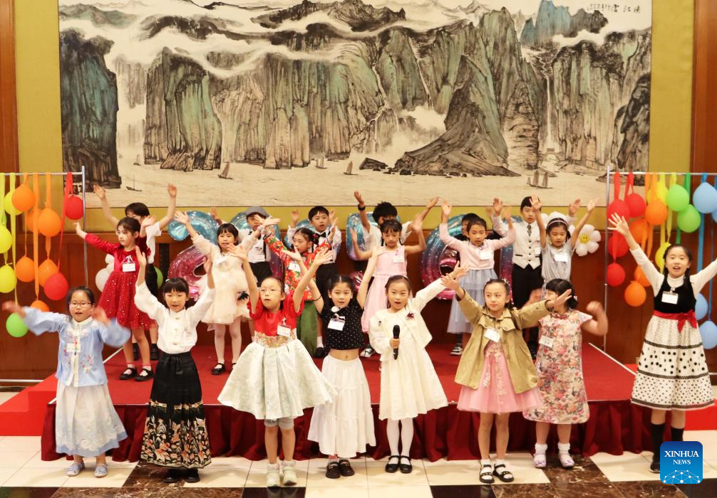 Children stage a performance in celebration of the International Children's Day at the Chinese Embassy in Japan, in Tokyo, Japan, June 1, 2025. Hundreds of Chinese and Japanese children gathered here on Sunday to celebrate the International Children's Day. (Xinhua/Yang Guang)