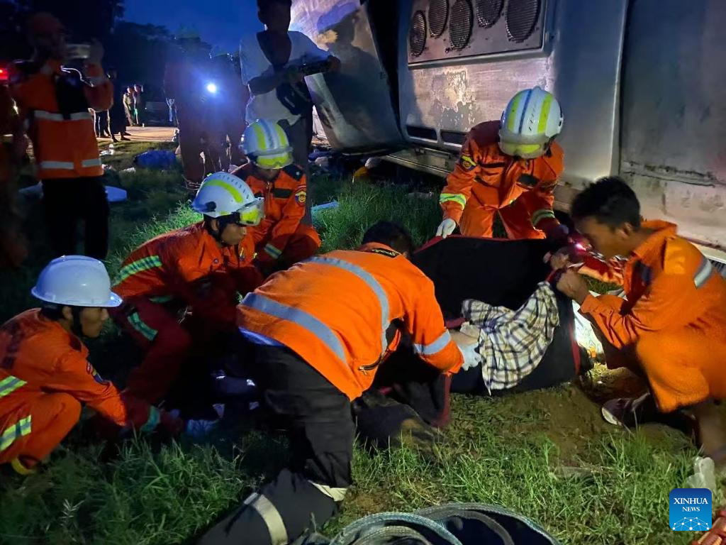Rescuers are seen in operation at the site of a bus accident in Meiktila township in Mandalay, Myanmar, June 2, 2025. (Myanmar Fire Services Department/Handout via Xinhua)