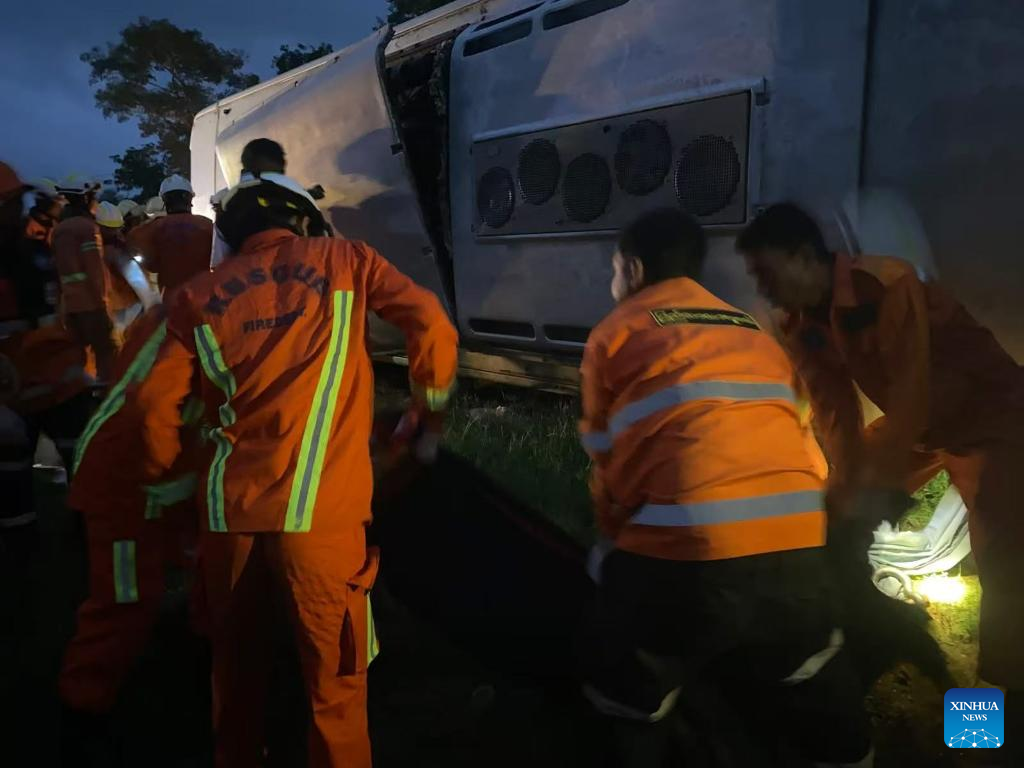 YANGON, June 2 (Xinhua) -- Six people were killed and 11 others injured after a highway passenger bus rolled over in central Myanmar's Mandalay region, an official from the Mandalay Region Fire Services Department told Xinhua on Monday.