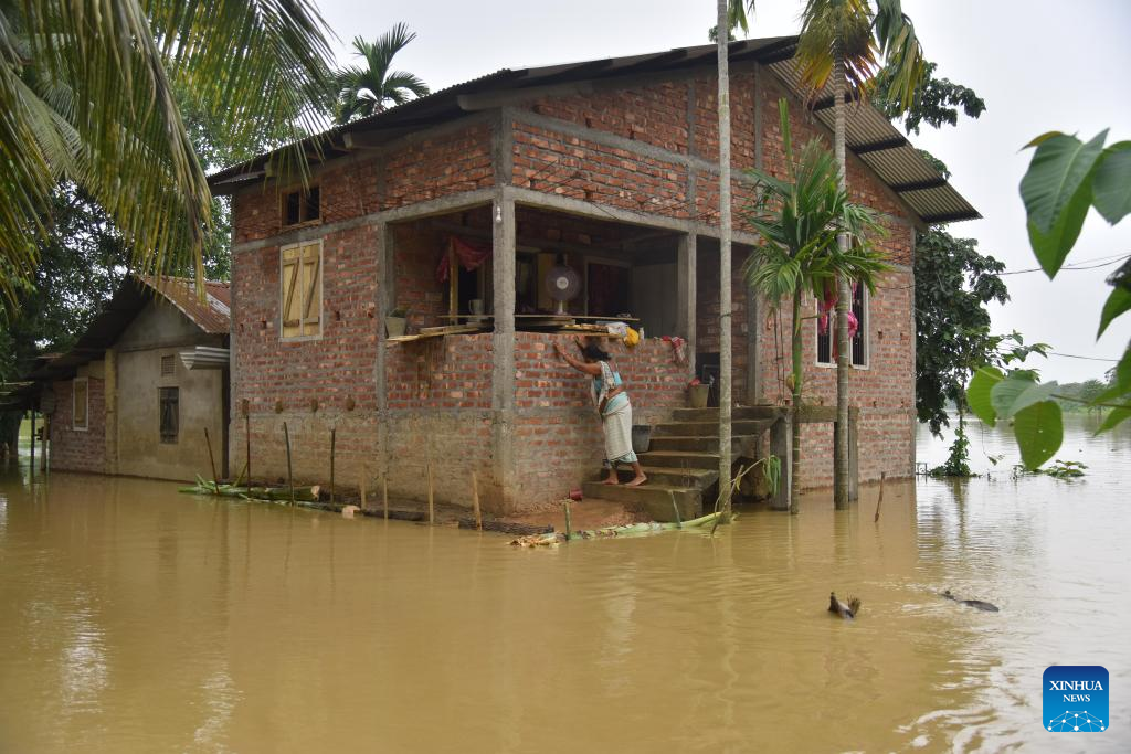 A house is seen partially submerged in floodwaters after heavy rain in Nagaon district of India's northeastern state of Assam, June 2, 2025. (Str/Xinhua)