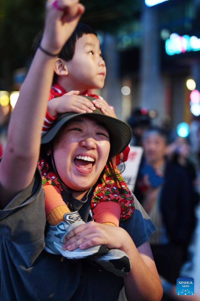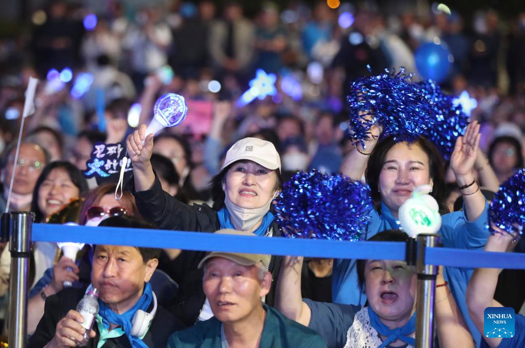 Supporters of Lee Jae-myung of South Korea's majority liberal Democratic Party follow the vote counting for South Korea's presidential election in Seoul, South Korea, June 3, 2025. Lee took a big lead in exit polls of the snap presidential election on Tuesday. (Xinhua/Yao Qilin)