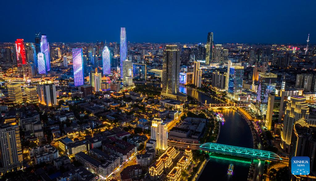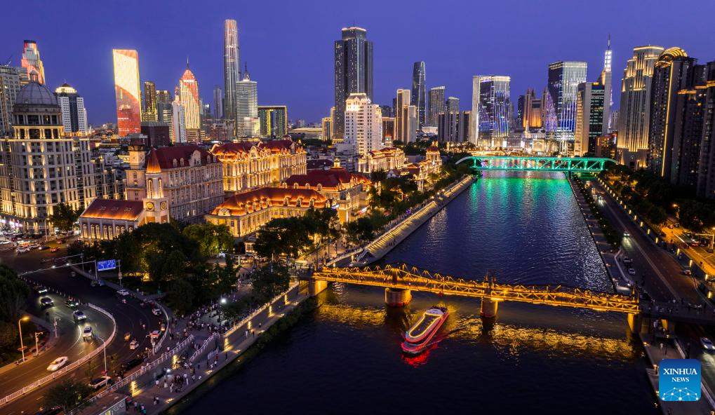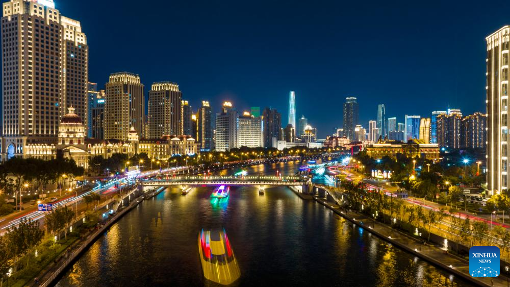 An aerial drone photo taken on June 5, 2025 shows a night view along the Haihe River in north China's Tianjin. Tianjin has upgraded the lighting facilities of 216 buildings, 13 bridges, 8.2 kilometers of riverbanks and 7 docks along the Haihe River since the beginning of this year. The landscape lighting along the river has been greatly improved, outlining a distinctive night view of the city. (Xinhua/Zhao Zishuo)