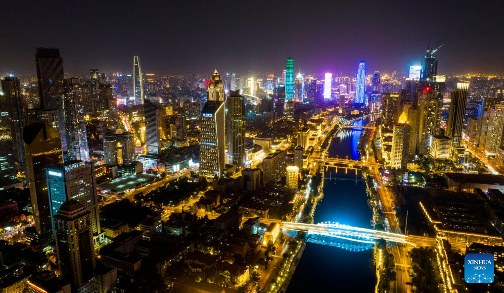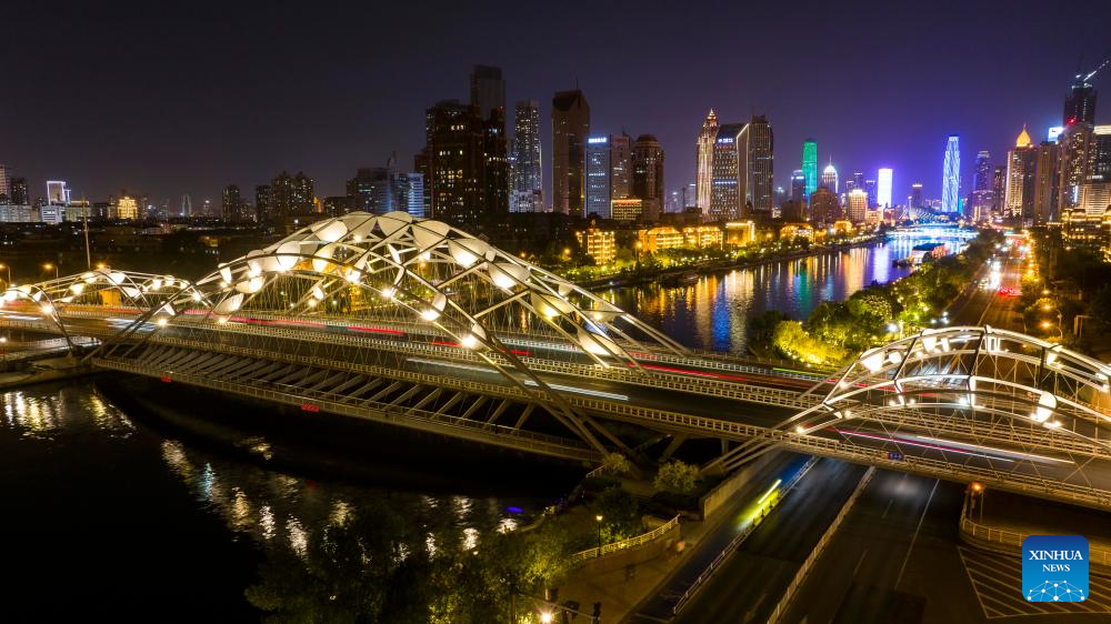 A drone photo taken on June 5, 2025 shows a night view along the Haihe River in north China's Tianjin. Tianjin has upgraded the lighting facilities of 216 buildings, 13 bridges, 8.2 kilometers of riverbanks and 7 docks along the Haihe River since the beginning of this year. The landscape lighting along the river has been greatly improved, outlining a distinctive night view of the city. (Xinhua/Zhao Zishuo)