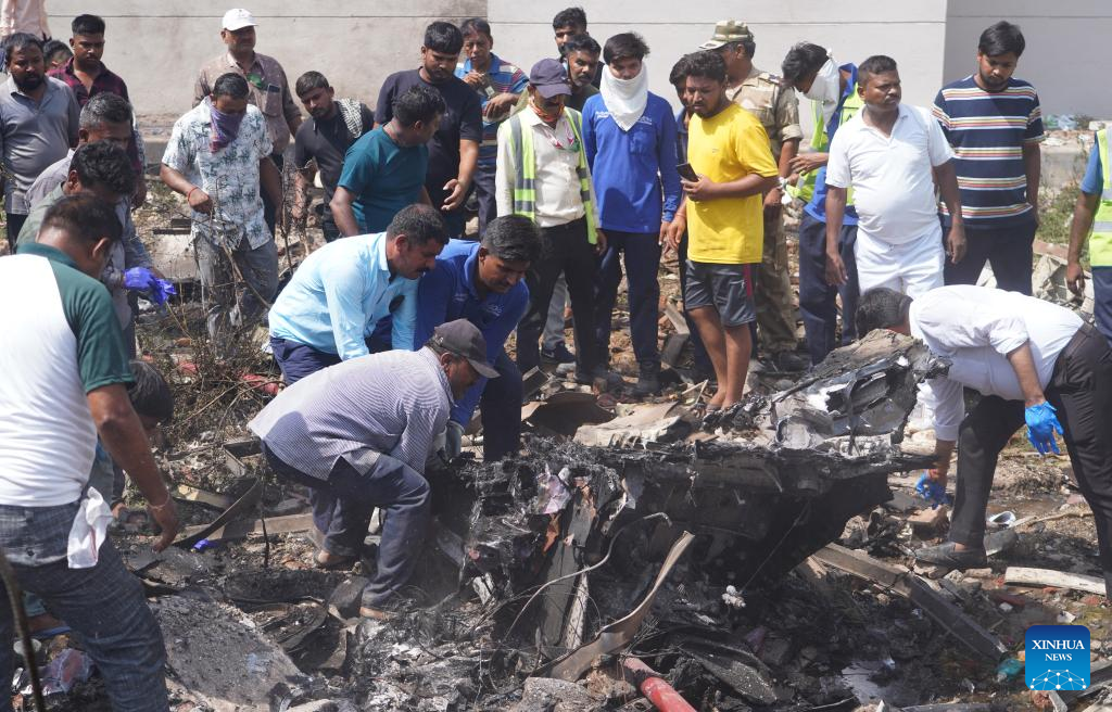 People conduct rescue work at the site of an Air India plane crash in Ahmedabad of India's Gujarat state, June 12, 2025. India's foreign ministry said a lot of people have lost their lives in the plane crash with 242 people on board the flight to London in the western state of Gujarat. (Str/Xinhua)