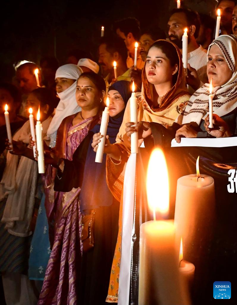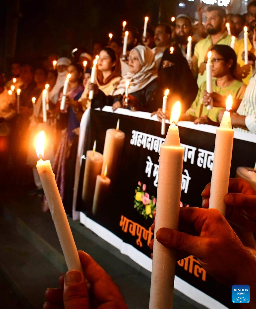 People holding lit candles mourn the victims of the Air India plane crash in Bhopal, the capital city of India's Madhya Pradesh state, June 13, 2025. According to the latest media reports, a total of 265 dead bodies had already been brought to a local government hospital in Ahmedabad city, where the plane crash had taken place.