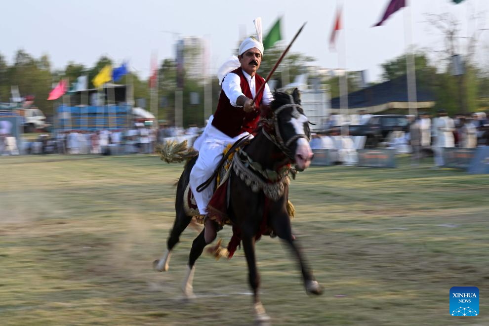 A horseman competes during a tent pegging competition in Islamabad, capital of Pakistan on June 14, 2025.