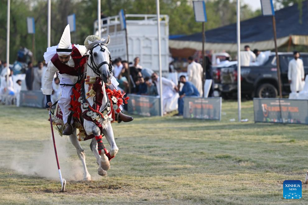 In tent pegging, a horseman gallops and uses a sword or a lance to pierce, pick up and carry away a wooden peg. (Xinhua/Ahmad Kamal)