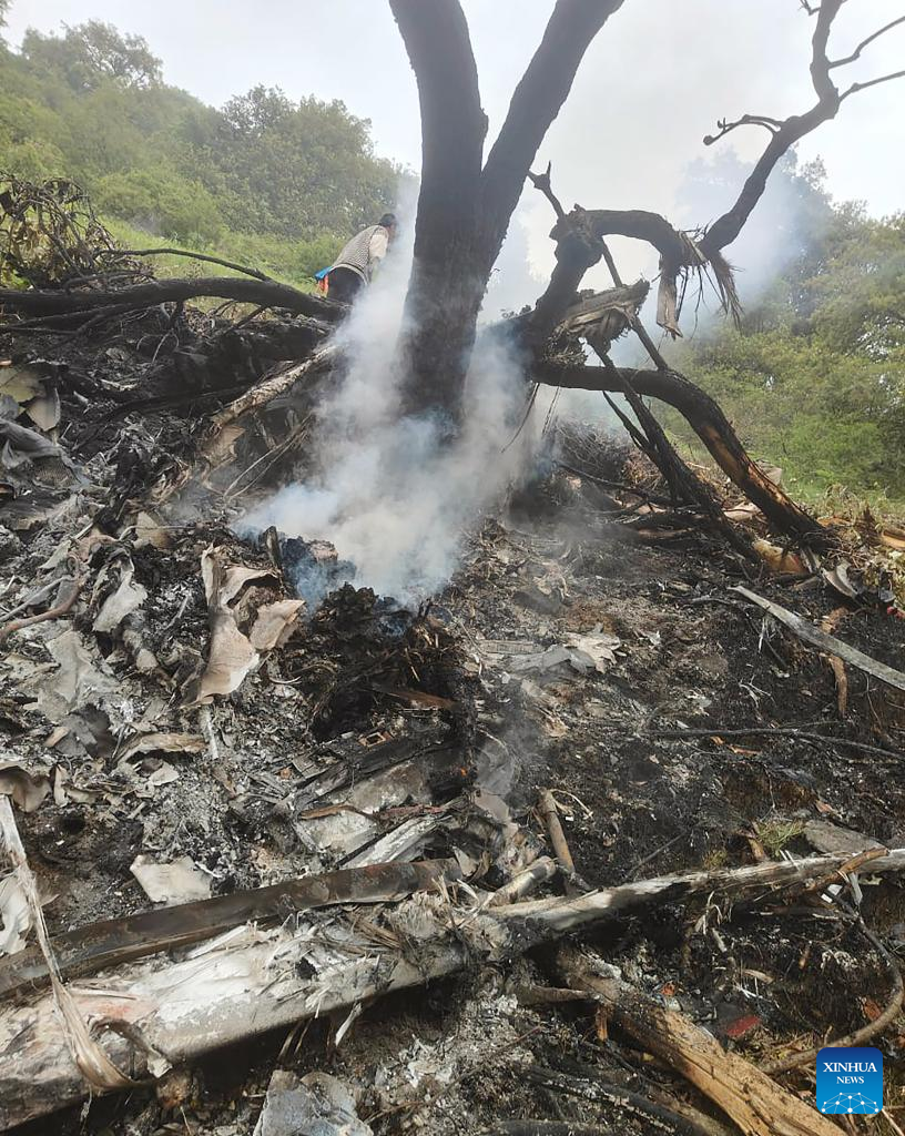 Seven people, including two children, the pilot and four male passengers, were dead in the private chopper crash in India's northern hilly state of Uttarakhand early on Sunday, a senior state government official said. (IANS/Handout via Xinhua)