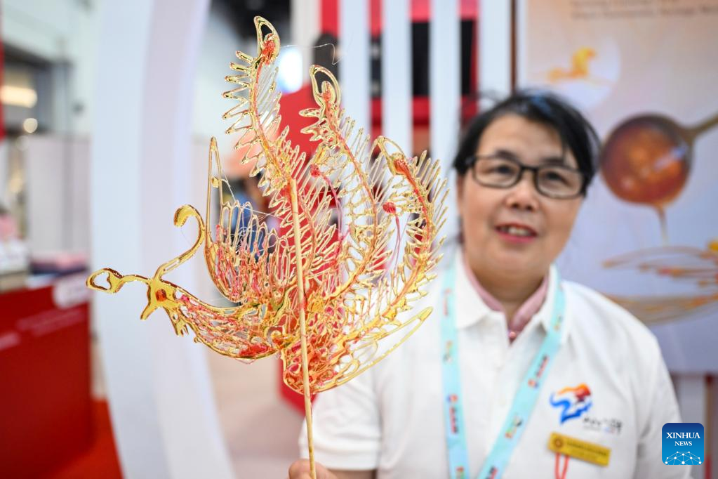 Li Fengyan, an inheritor of the sugar figure making technique from northeast China's Liaoning Province, demonstrates a sugar painting during the second edition of the "Nihao! China" Travel Fair (Malaysia) at the Pavilion Bukit Jalil Exhibition Center in Kuala Lumpur, Malaysia, June 13, 2025.