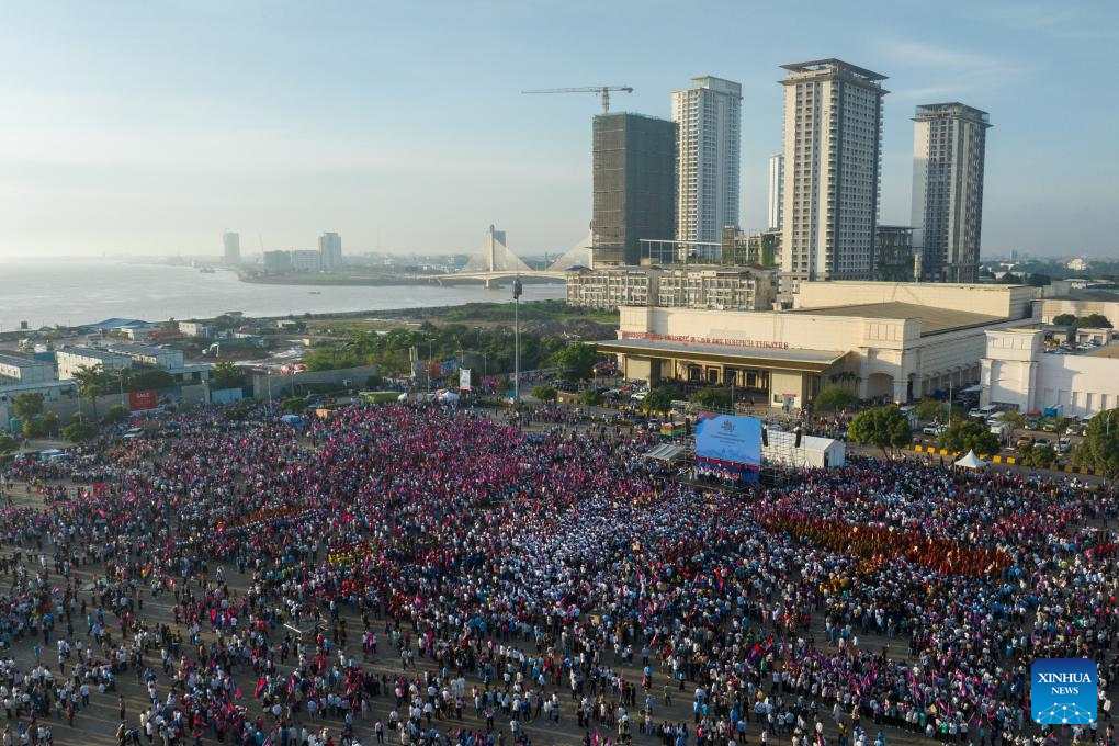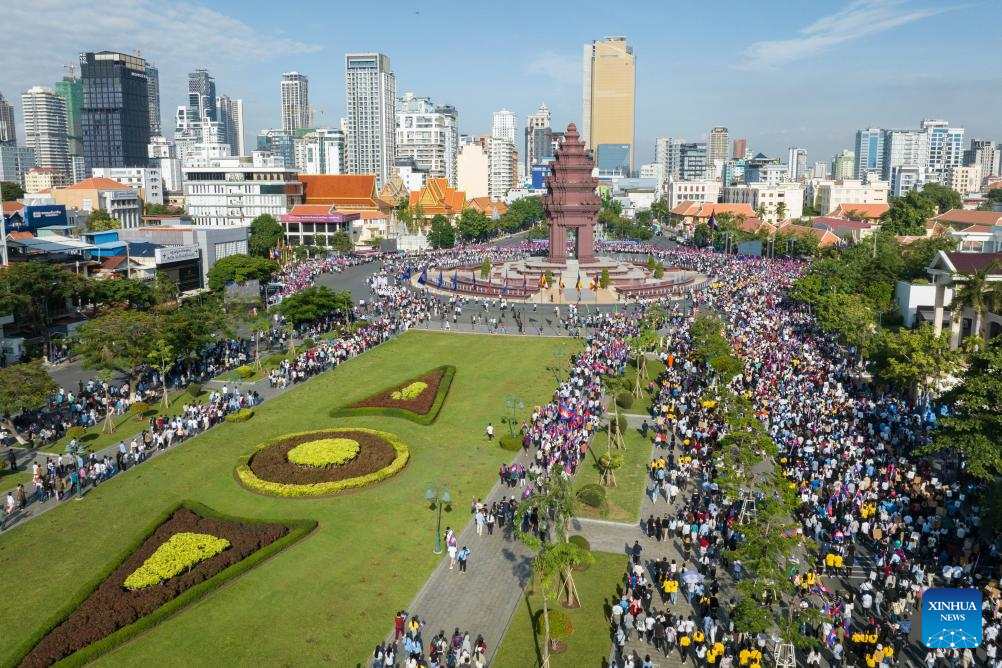 Tens of thousands of Cambodians joined the march here on Wednesday as border tensions with Thailand mounted. (Photo by Kimlong Meng/Xinhua)