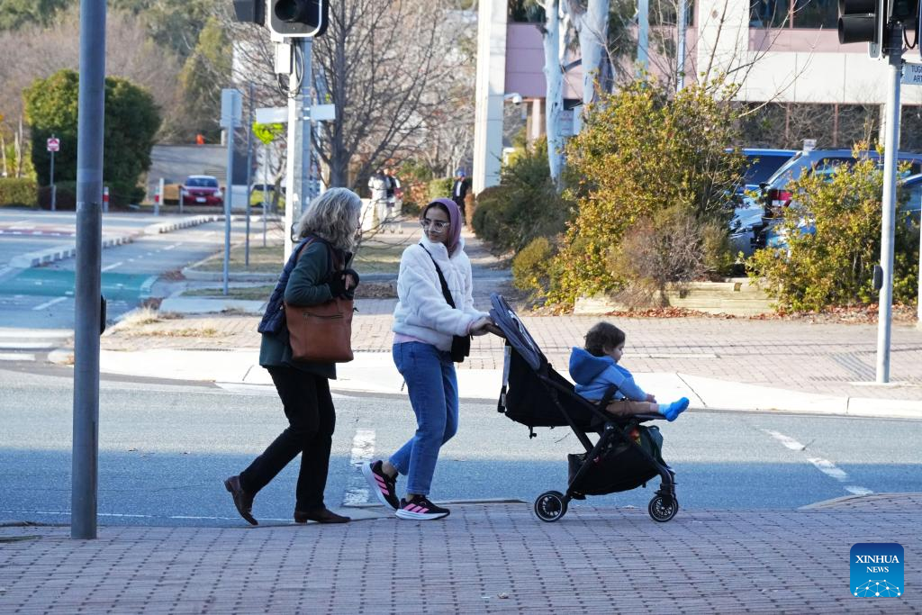 People with a child in a stroller walk on Anketell Street in Canberra, Australia, June 19, 2025. Net migration to Australia fell by over 30 percent in 2024, driving the country's population growth to a three-year low. (Photo by Zhang Na/Xinhua)