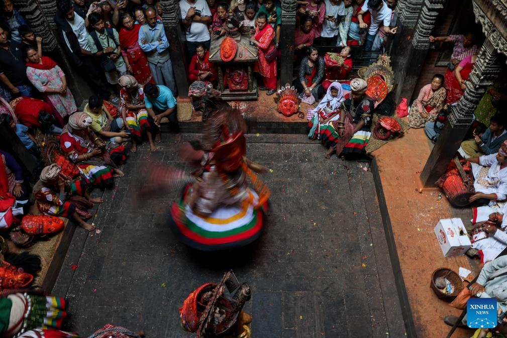 People gather for a traditional Navadurga dance performance in Bhaktapur, Nepal, June 18, 2025. Navadurga means nine forms of goddess Durga. (Photo by Sulav Shrestha/Xinhua)