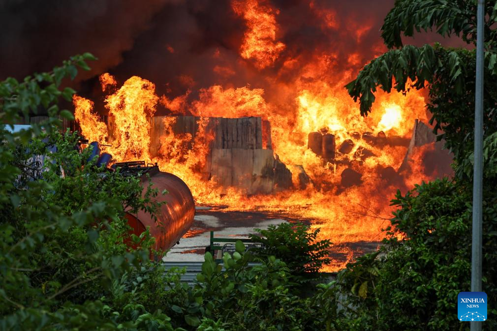 This photo taken on June 21, 2025 shows the site of a huge fire at an industrial facility storing engine oil and lorries in Johor state, Malaysia. (Bernama via Xinhua)