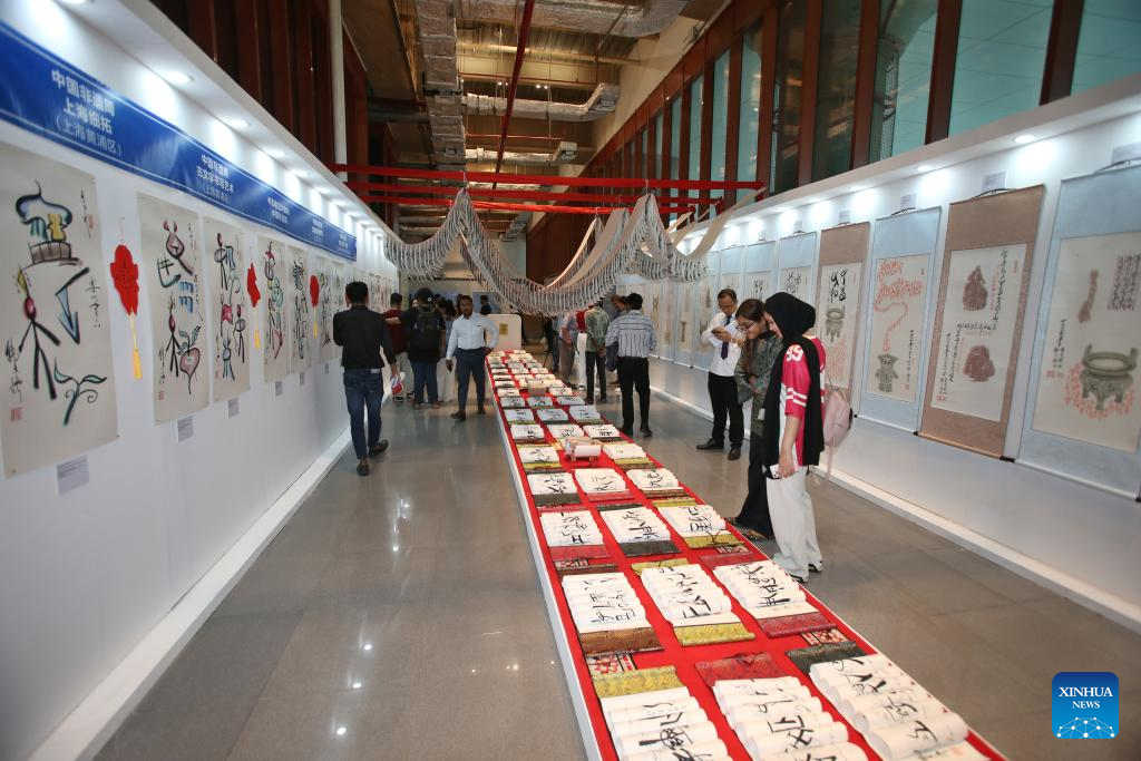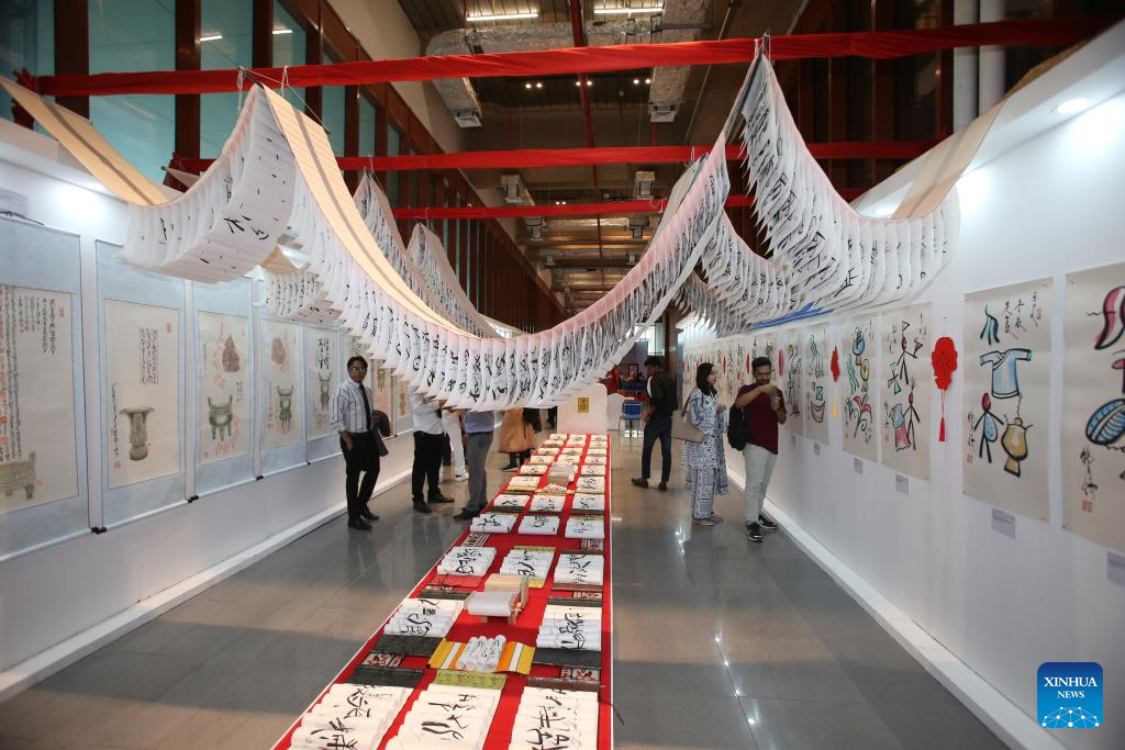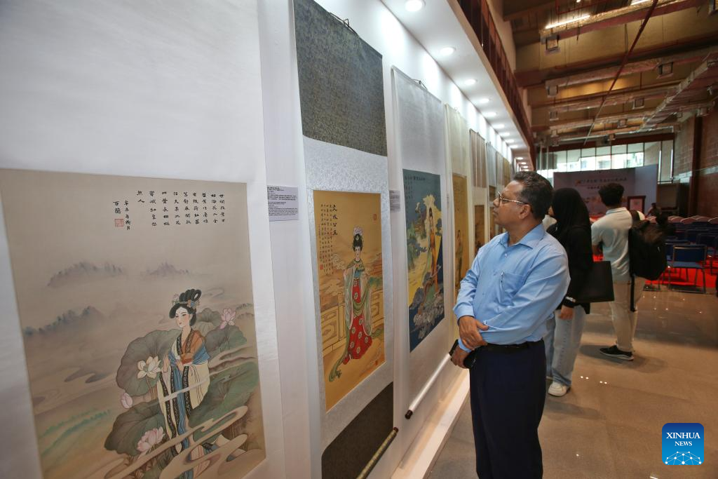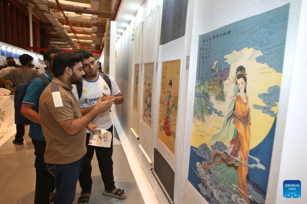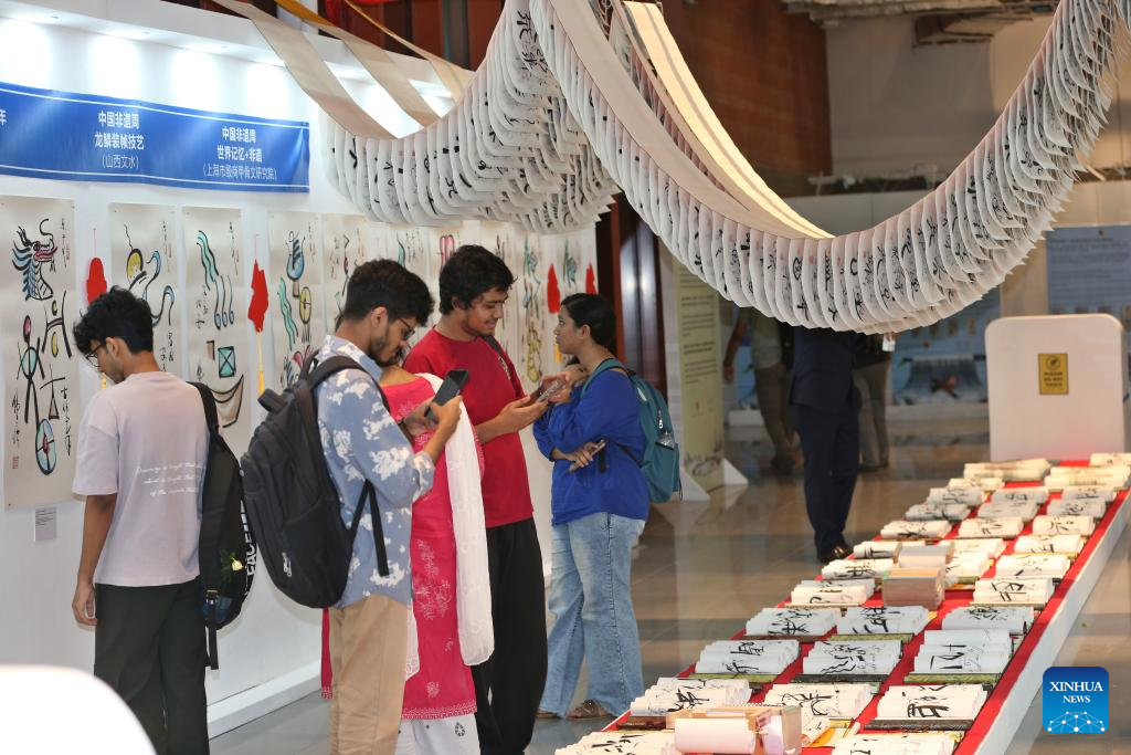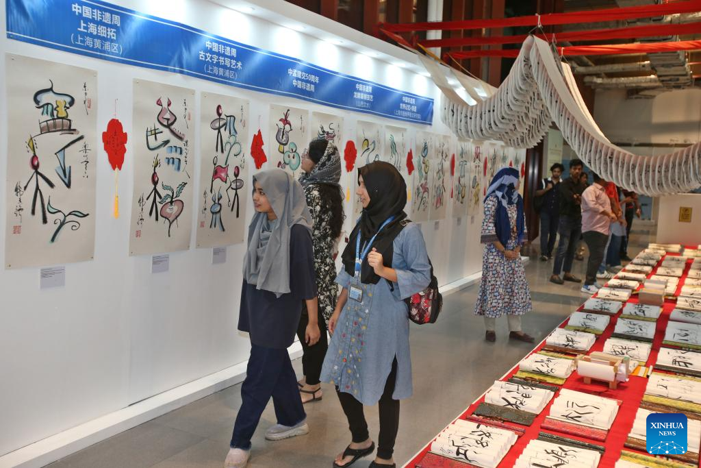 People visit an exhibition during the China Intangible Cultural Heritage Week held at the BRAC University in Dhaka, Bangladesh on June 22, 2025. The five-day China Intangible Cultural Heritage Week kicked off here on Sunday. The exhibition, main part of the event, featured dozens of outstanding Chinese artworks, including elegant lady paintings and Dongba pictographic calligraphy, as well as some Chinese intangible cultural heritage crafts. (Photo by Habibur Rahman/Xinhua)