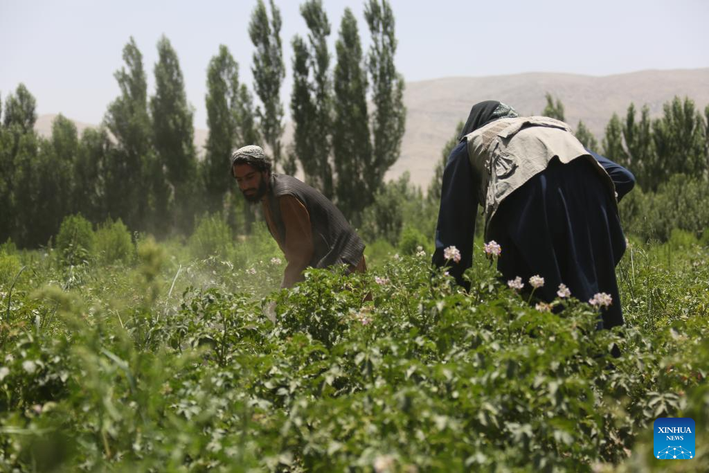 Afghan farmers cultivate legal crops on land that was previously used for growing opium poppies in Wardak province, Afghanistan, June 23, 2025. The Afghan interim government has worked to find alternative strategies for farmers to stop the cultivation, smuggling, and trafficking of narcotics through various methods. Local officials have launched public awareness campaigns and are offering agricultural alternatives. (Photo by Saifurahman Safi/Xinhua)