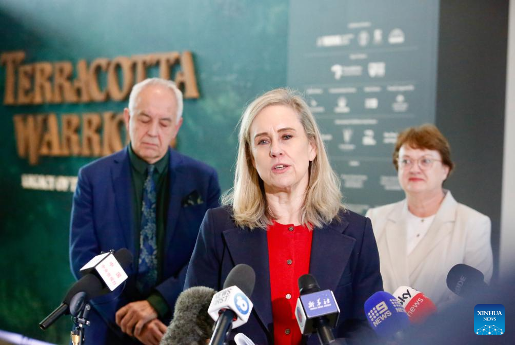 Simone McGurk, minister for creative industries of the state government of Western Australia, speaks during the opening ceremony of the "Terracotta Warriors: Legacy of the First Emperor" exhibition at the Western Australian Museum Boola Bardip in Perth, Australia, June 25, 2025. The museum will host more than 225 artefacts from the dynasties of Qin (221-207 BC) and Han (202 BC-AD 220), including 10 Terracotta Warriors, for eight months starting from June 28.