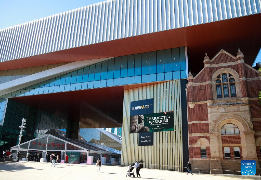 Posters of the "Terracotta Warriors: Legacy of the First Emperor" exhibition are pictured outside the Western Australian Museum Boola Bardip in Perth, Australia, June 25, 2025. The museum will host more than 225 artefacts from the dynasties of Qin (221-207 BC) and Han (202 BC-AD 220), including 10 Terracotta Warriors, for eight months starting from June 28.