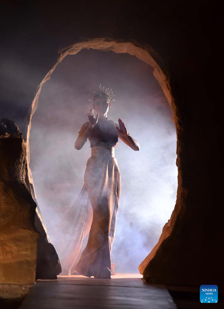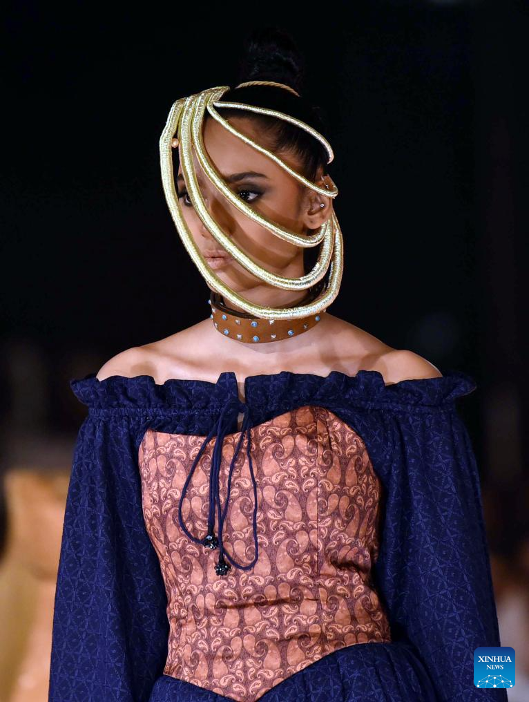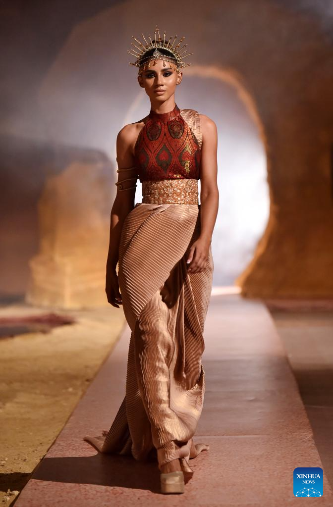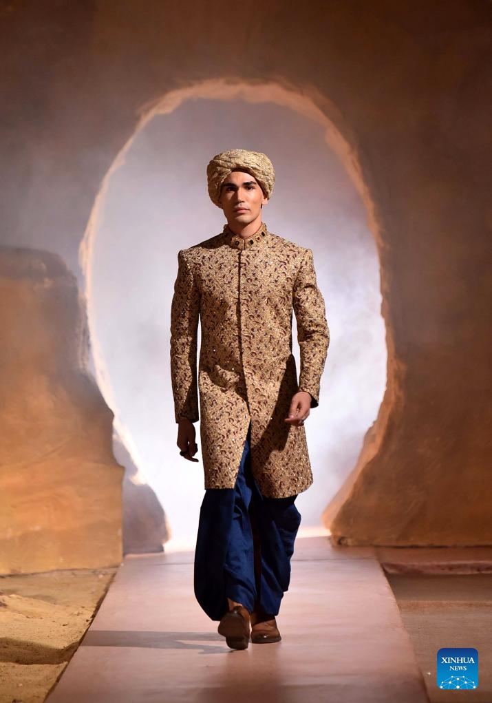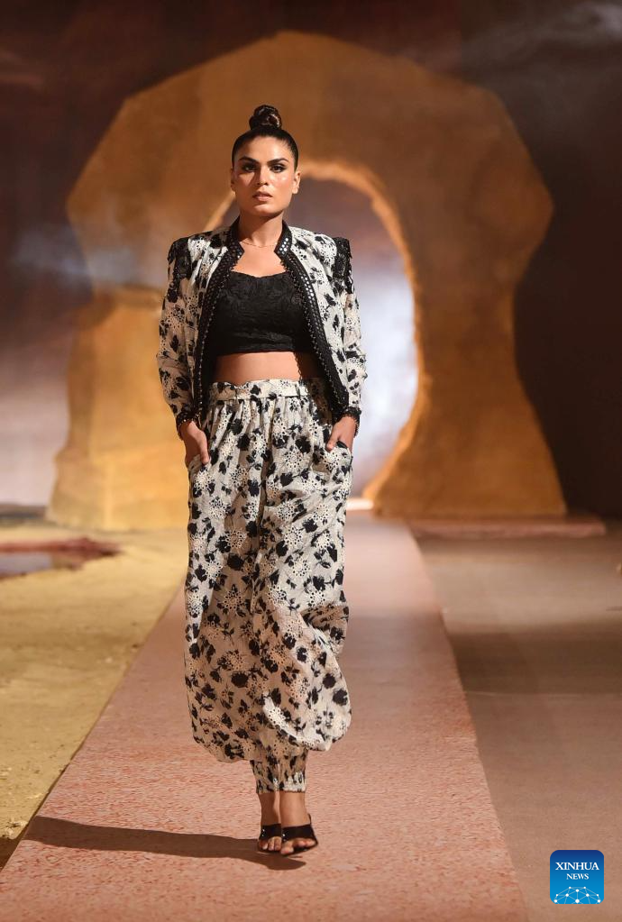 A model presents a creation during a fashion show in Karachi, southern Pakistan, on June 25, 2025. (Str/Xinhua)