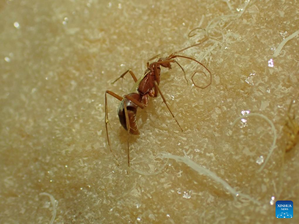 This photo taken on April 24, 2025 shows a dead eyeless spider found in a cave beneath the Nullarbor Plain in southern Australia.(Photo by Steve Milner/Xinhua)