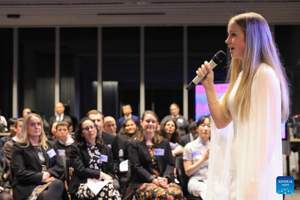A New Zealander who once studied in China shares her experience at an alumni reception in Wellington, New Zealand, on June 26, 2025. (Photo by Meng Tao/Xinhua)