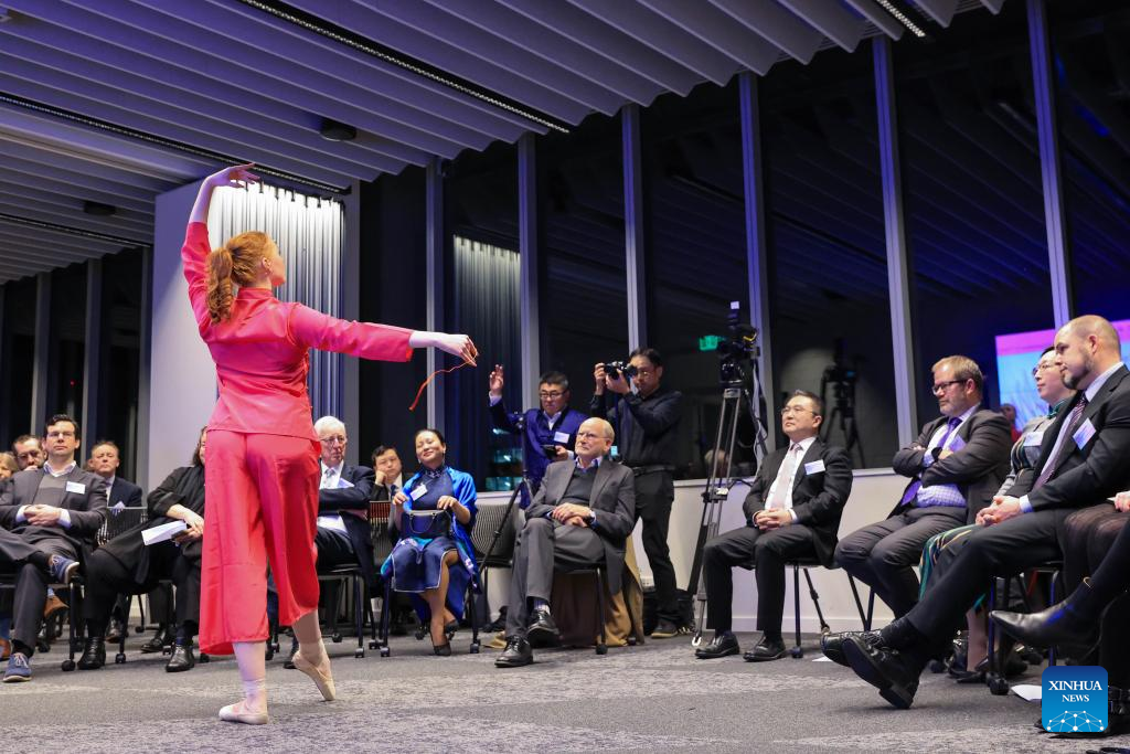 A New Zealander who once studied in China performs ballet at an alumni reception in Wellington, New Zealand, on June 26, 2025. (Photo by Meng Tao/Xinhua)