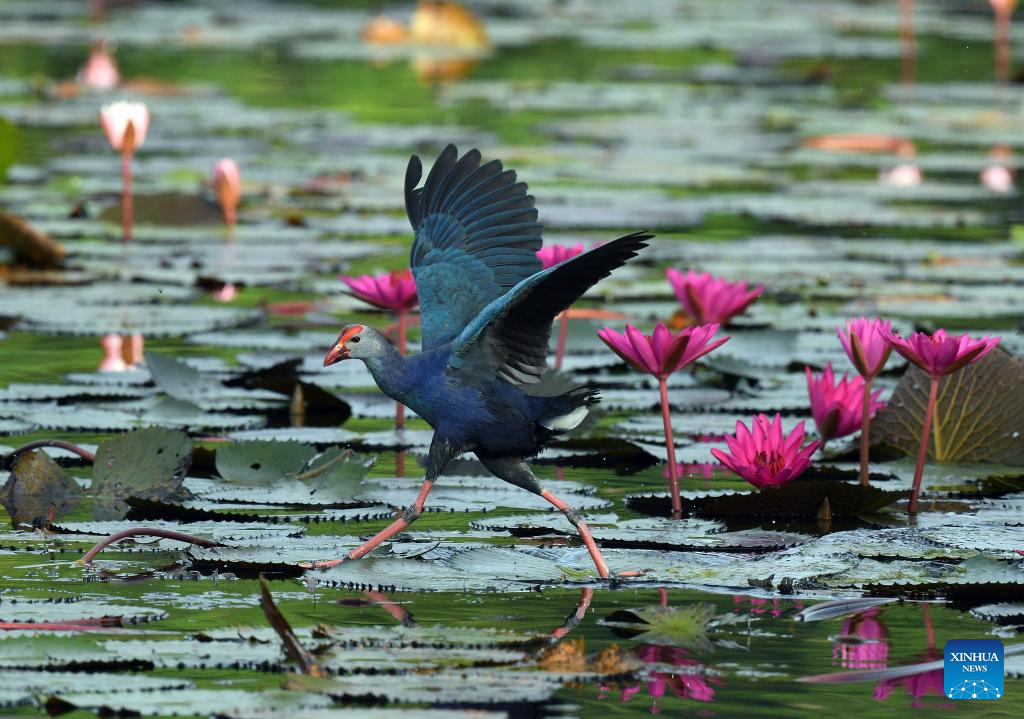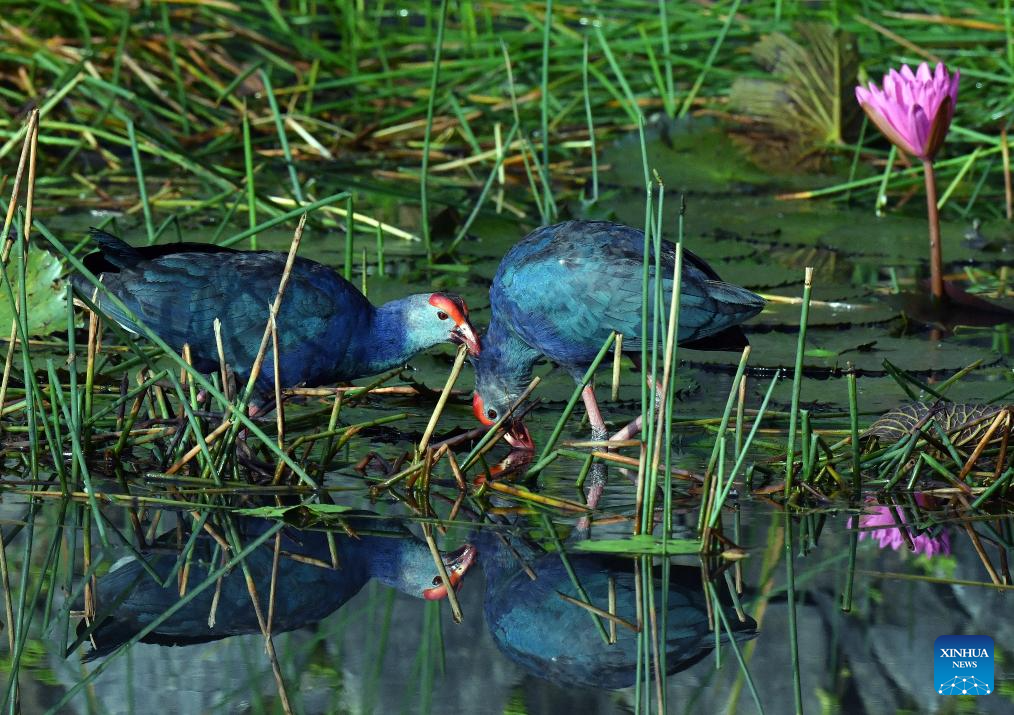 Gray-headed swamphens are pictured in the suburb of Colombo, Sri Lanka, June 28, 2025. (Photo by Ajith Perera/Xinhua)