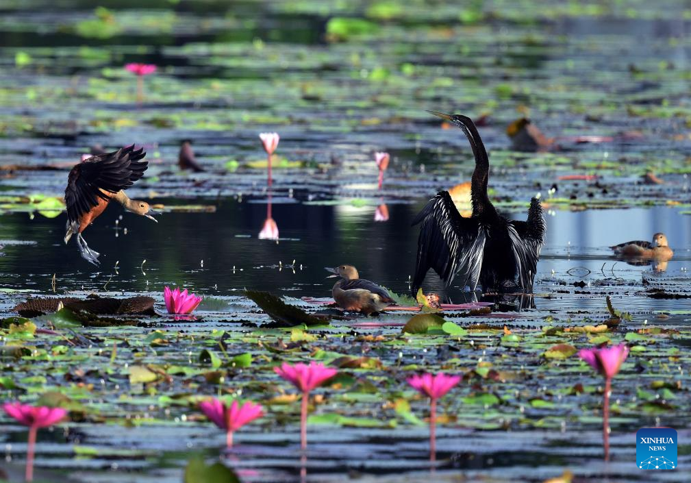 An anhinga and some lesser whistling ducks are pictured in the suburb of Colombo, Sri Lanka, June 28, 2025. (Photo by Ajith Perera/Xinhua)