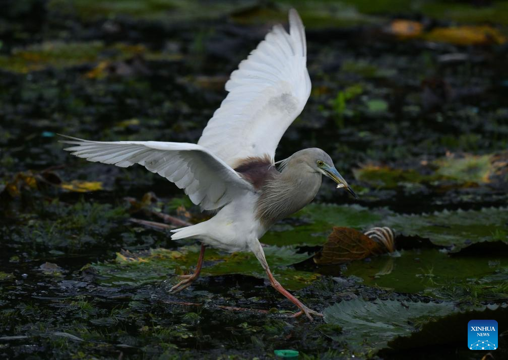 An Indian pond heron catches a fish in the suburb of Colombo, Sri Lanka, June 28, 2025. (Photo by Ajith Perera/Xinhua)