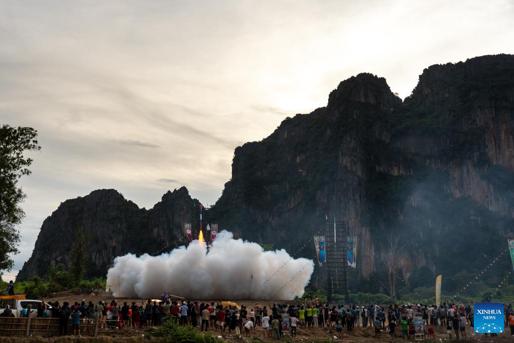 VIENTIANE, June 29 (Xinhua) -- As the rainy season begins, people across Laos celebrate the annual Rocket Festival with cheers and rockets soaring into the sky -- a joyful gathering of friends and families embracing the green season and hoping for a rich harvest.