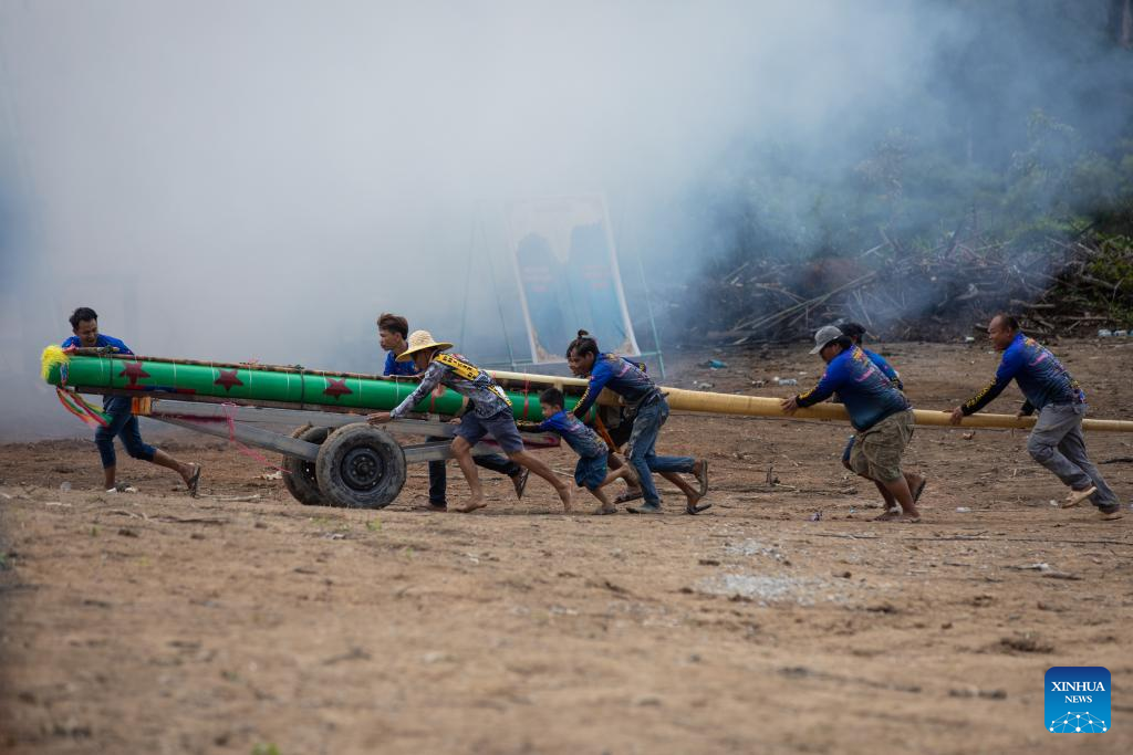 People participate in the Rocket Festival in Vientiane Province, Laos, June 29, 2025. As the rainy season begins, people across Laos celebrate the annual Rocket Festival with cheers and rockets soaring into the sky -- a joyful gathering of friends and families embracing the green season and hoping for a rich harvest.(Photo by Kaikeo Saiyasane/Xinhua)
