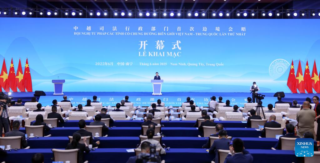 This photo taken on June 28, 2025 shows the opening ceremony of a border meeting held by Judicial administrative authorities from China and Vietnam, in Nanning, south China's Guangxi Zhuang Autonomous Region. Judicial administrative authorities from China and Vietnam held a border meeting from Saturday to Sunday in Nanning, capital of south China's Guangxi Zhuang Autonomous Region, to enhance cooperation. The meeting, the first of its kind, brought together nearly 150 participants from both countries, including officials from the justice departments, local judicial administrative organs, and legal professions. (Xinhua/Yin Gang)