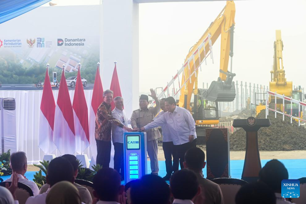 Indonesian President Prabowo Subianto (C) attends a groundbreaking ceremony for a major electric vehicle (EV) battery megaproject in Karawang, West Java, Indonesia, June 29, 2025. (Xinhua/Zulkarnain)