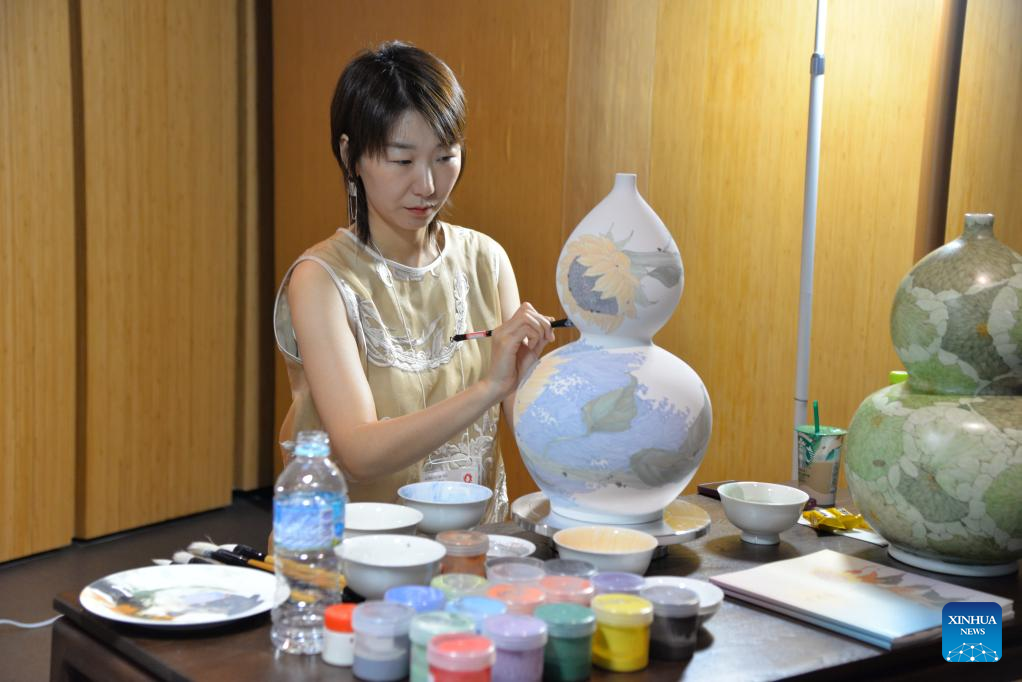 Photo taken on July 2, 2025, shows a demonstration of Jingdezhen porcelain craft during Jiangxi Day of China Pavilion at Expo 2025 Osaka in Osaka, Japan. Jiangxi Day of China Pavilion was held Wednesday at Expo 2025 Osaka, with more than 120 guests attending the opening ceremony. Under the theme of "Building a Jiangxi Model of Beautiful China and Envisioning a Green Development Future for Jiangxi," the event featured exhibitions, investment promotions, cultural performances and intangible cultural heritage products display. (Xinhua/Tu Yifan)