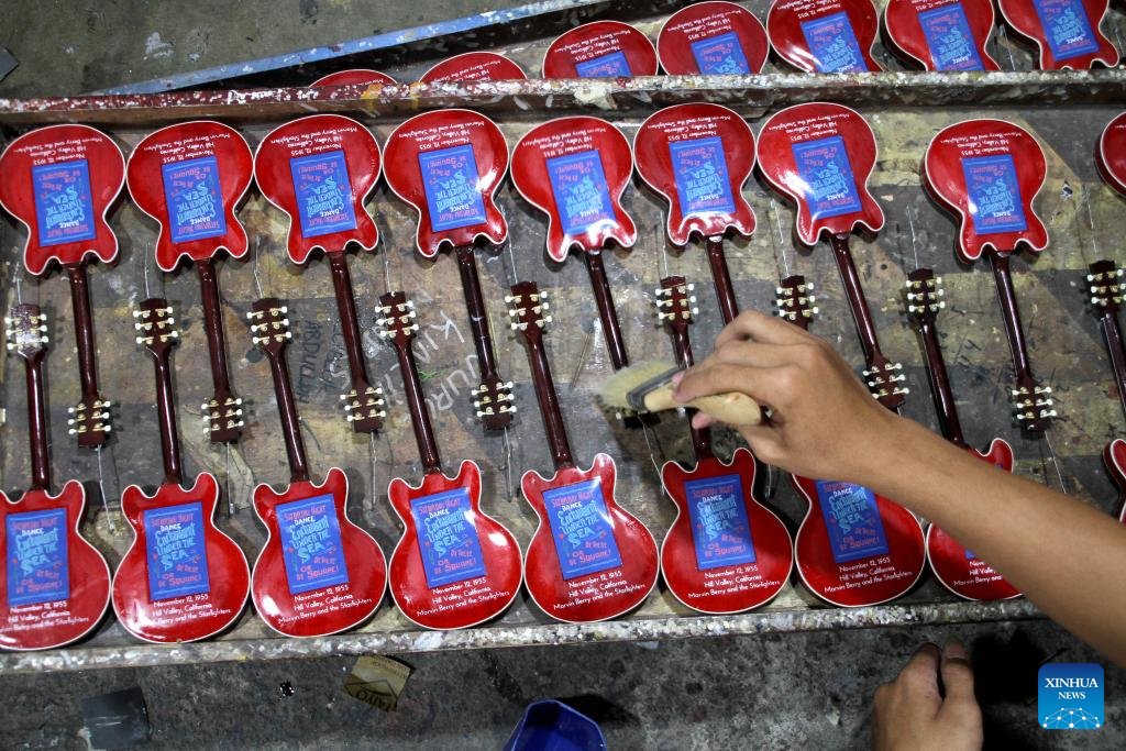 Miniature guitar collections are seen at a handicraft workshop in Klaten Regency, Central Java, Indonesia, on July 3, 2025. Those miniature guitars are made from mahogany, aluminum, fiber, resin and strings. (Photo by Bram Selo/Xinhua)