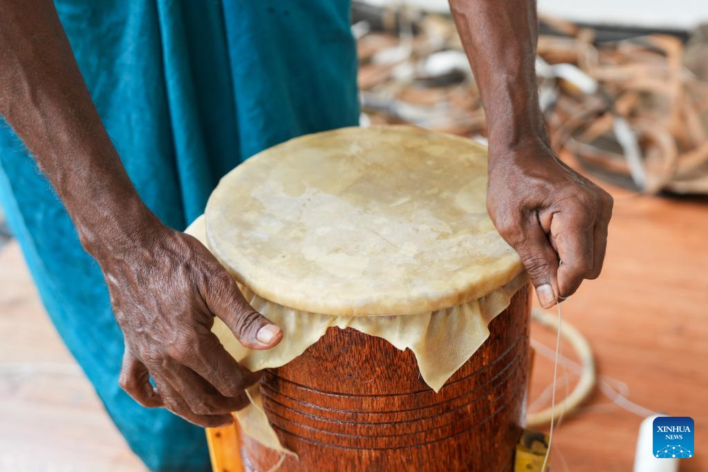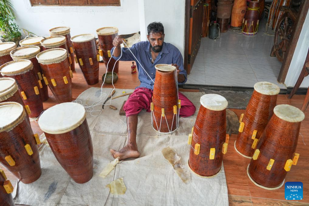 A man assembles a traditional drum in Kadugannawa, Sri Lanka, July 3, 2025. The central region of Sri Lanka, especially Kadugannawa, is famous for the making and use of traditional wooden drums, which play an important role in Sri Lankan rituals and dances. (Photo by Thilina Kaluthotage/Xinhua)