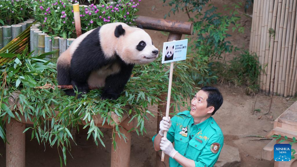 Hui Bao, one of a giant panda twins, interacts with its keeper during a celebration of the twins' second birthday at Everland Resort in Yongin, South Korea, July 7, 2025. The giant panda twins Rui Bao and Hui Bao celebrated their second birthday here on Monday.