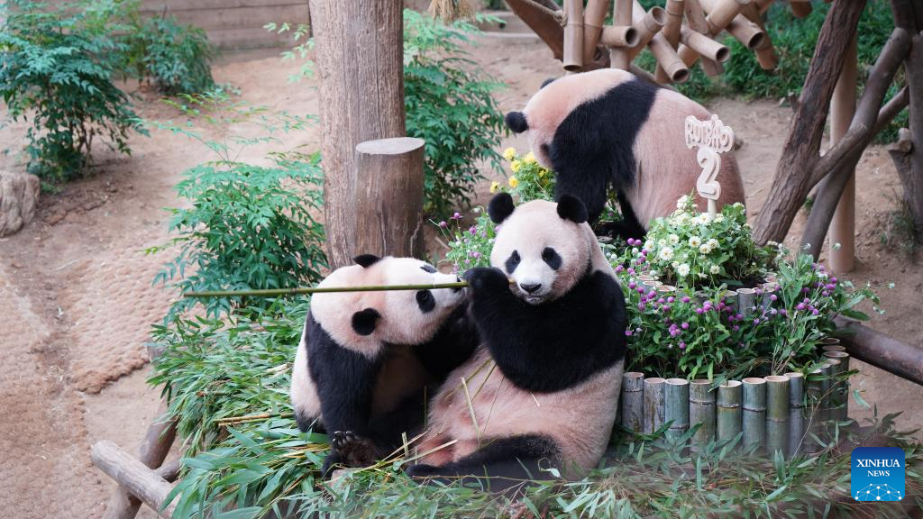 Giant panda twins Rui Bao and Hui Bao are pictured during a celebration of their second birthday with their mother Ai Bao (R, front) at Everland Resort in Yongin, South Korea, July 7, 2025. The giant panda twins Rui Bao and Hui Bao celebrated their second birthday here on Monday.