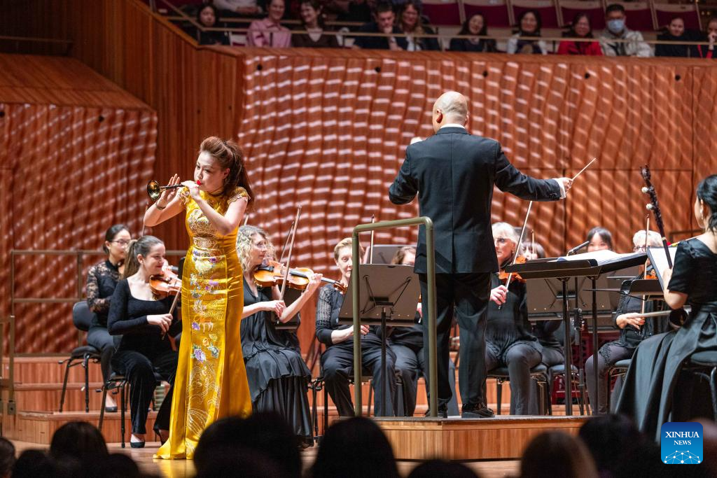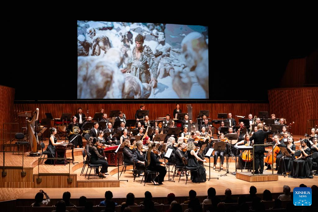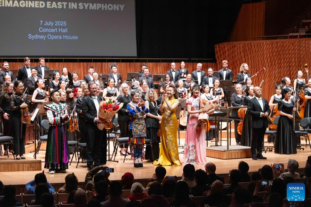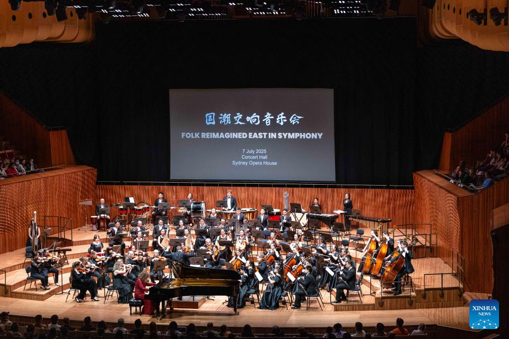 Musicians from Guizhou Chinese Orchestra and the Australia Orchestra perform in the "Folk Reimagined: East in Symphony" concert at the Opera House in Sydney, Australia, July 7, 2025. (Ryan Maxwell Event/Handout via Xinhua)