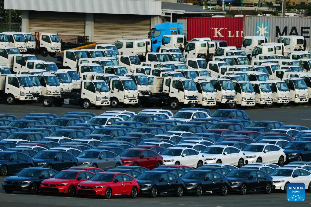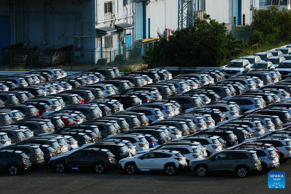 This photo taken on July 3, 2025 shows cars for sale at a port in Yokohama, Japan. Japanese Prime Minister Shigeru Ishiba said Tuesday that U.S. President Donald Trump's decision to impose a 25 percent tariff on Japan is "truly regrettable," noting bilateral negotiations will continue toward a mutually beneficial deal. (Xinhua/Jia Haocheng)