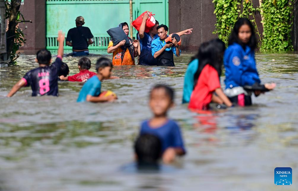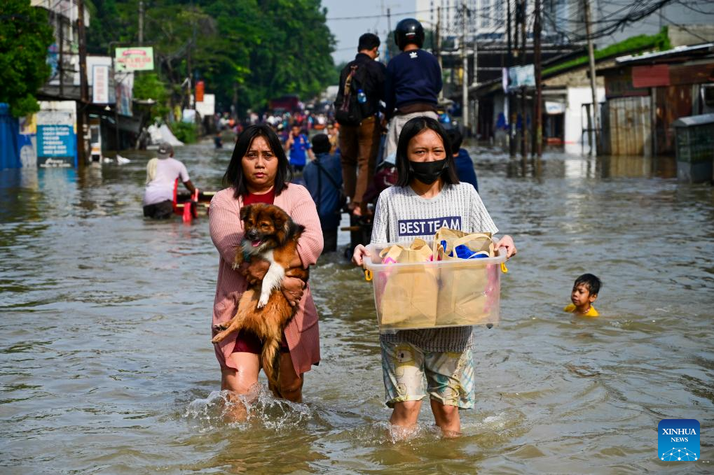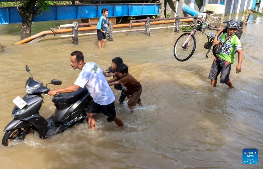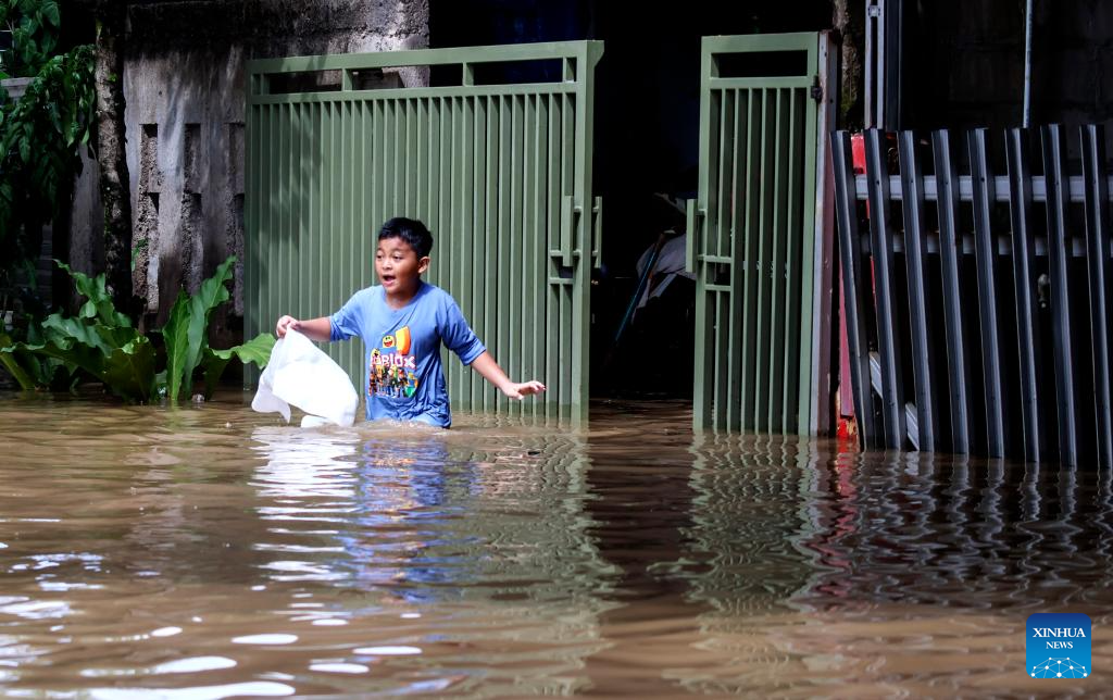 Residents walk through flood water after heavy rain in Tangerang, Banten province, Indonesia, July 8, 2025. (Xinhua/Zulkarnain)