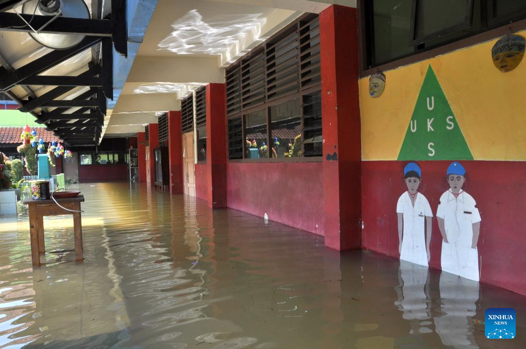 Waterlogged classrooms are seen after heavy rain hit in Jakarta, Indonesia, July 8, 2025. (Photo by Rahmat Dian P./Xinhua)