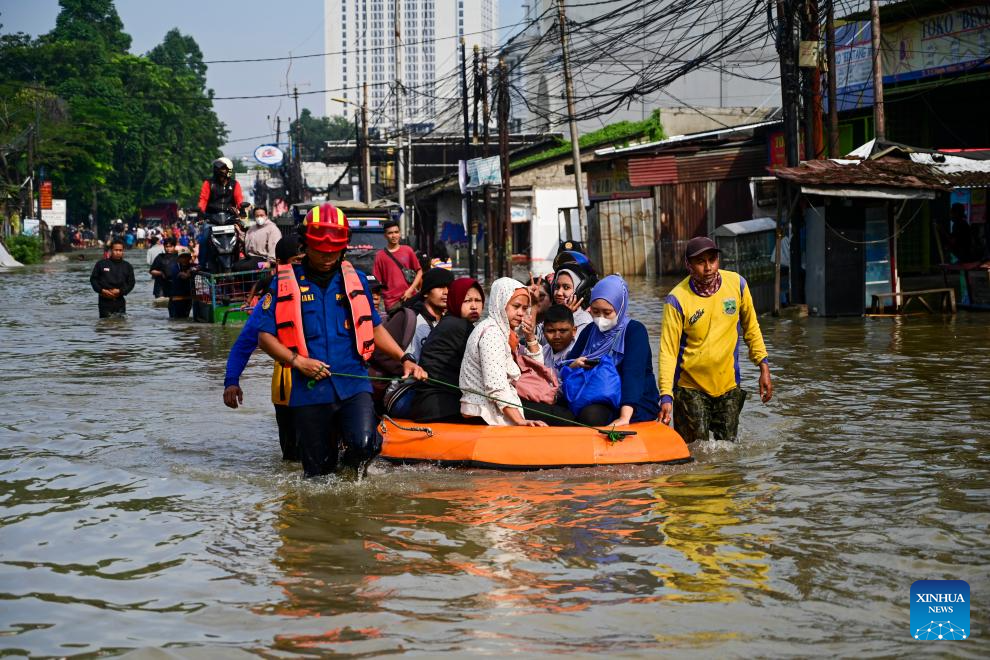 Rescuers help residents evacuate after heavy rain in Tangerang, Banten province, Indonesia, July 8, 2025. (Xinhua/Zulkarnain)