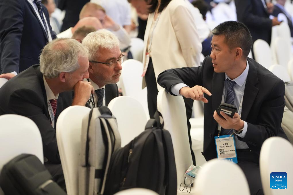 Guests communicate during the 12th World Congress on High-Speed Rail in Beijing, capital of China, July 8, 2025. Themed "High-Speed Rail: Innovation and Development for a Better Life", the congress opened here on July 8. More than 2,000 participants, including railway technical personnel, enterprise leaders, government officials, and representatives from international organizations, attended the opening ceremony. (Xinhua/Xing Guangli)