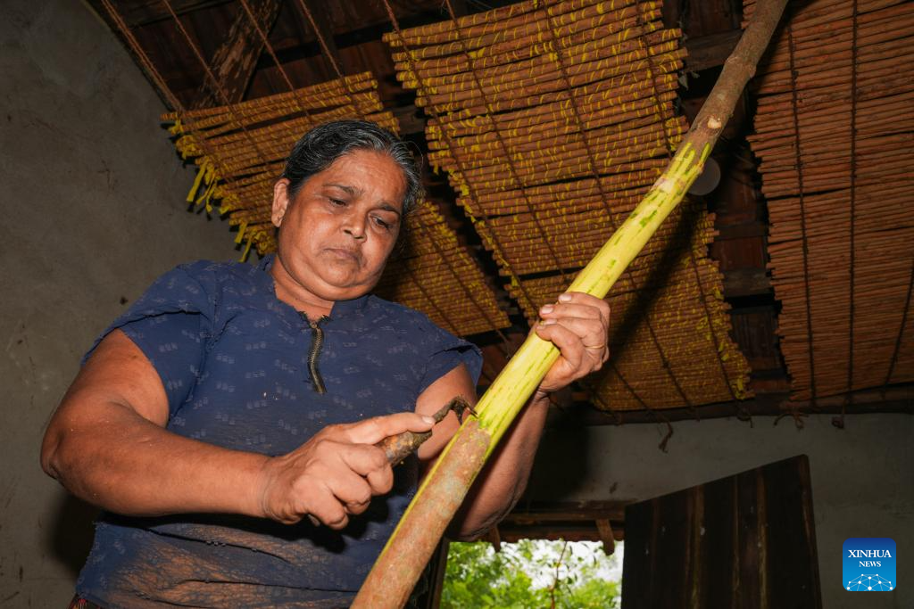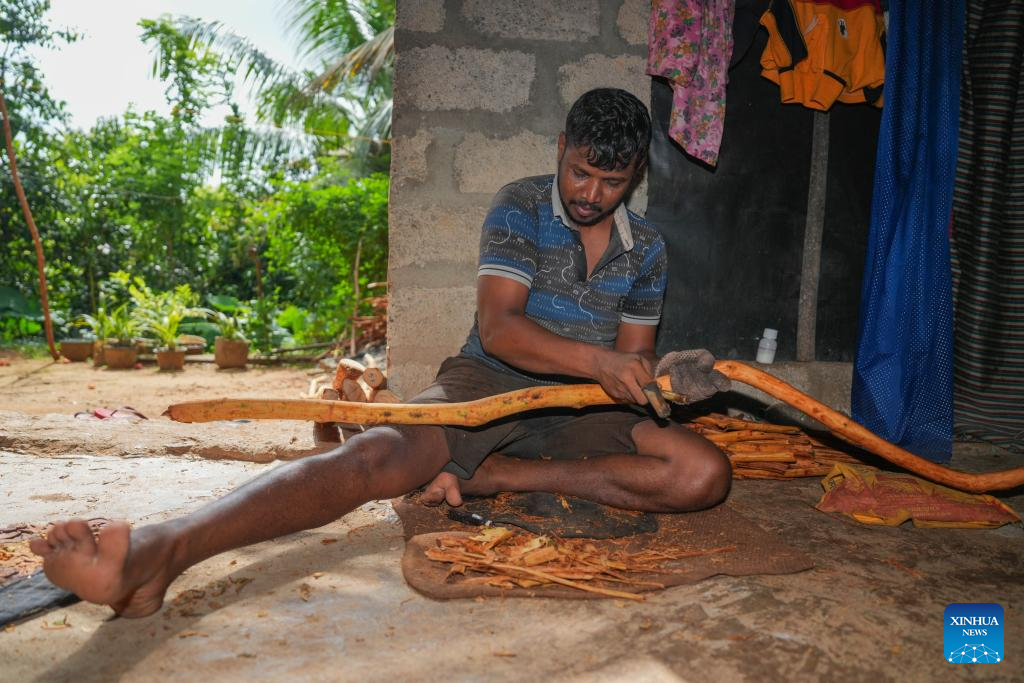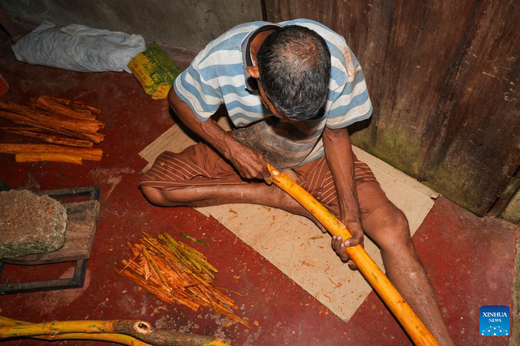 A worker processes cinnamon in Galle, Sri Lanka, July 9, 2025. Sri Lanka aims to make cinnamon the country's foremost export-oriented plantation crop. (Photo by Thilina Kaluthotage/Xinhua)