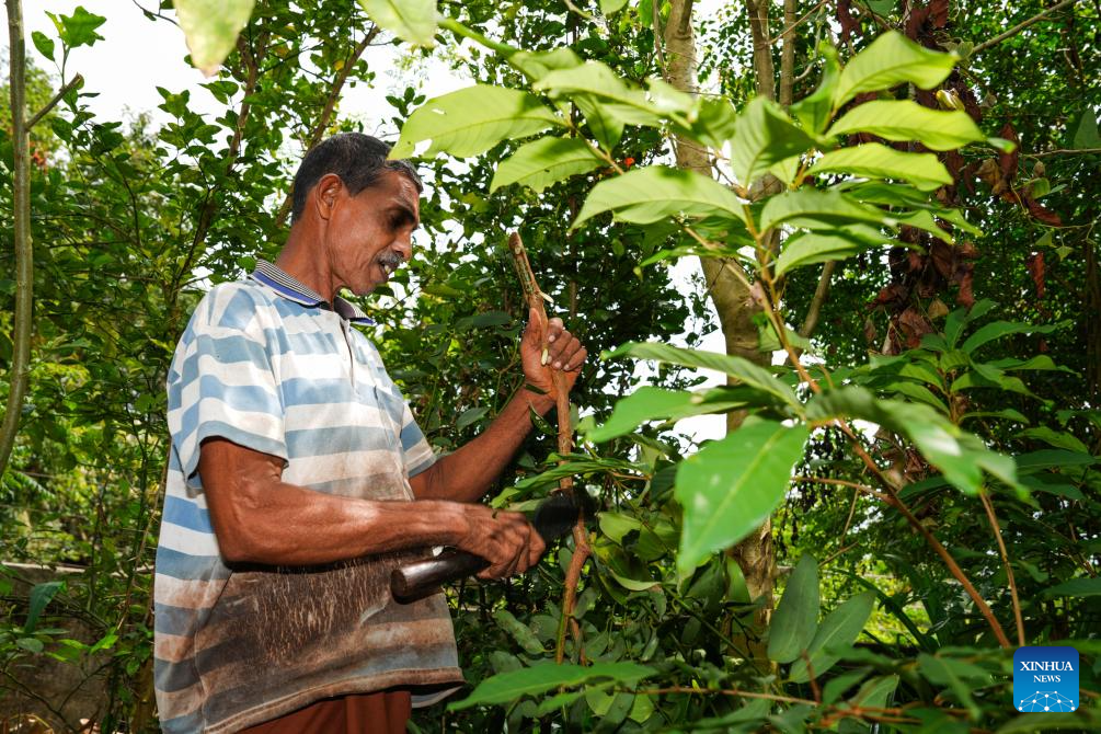 A worker cuts cinnamon in Galle, Sri Lanka, July 9, 2025. Sri Lanka aims to make cinnamon the country's foremost export-oriented plantation crop. (Photo by Thilina Kaluthotage/Xinhua)