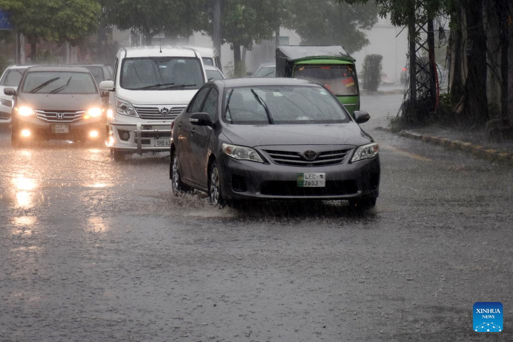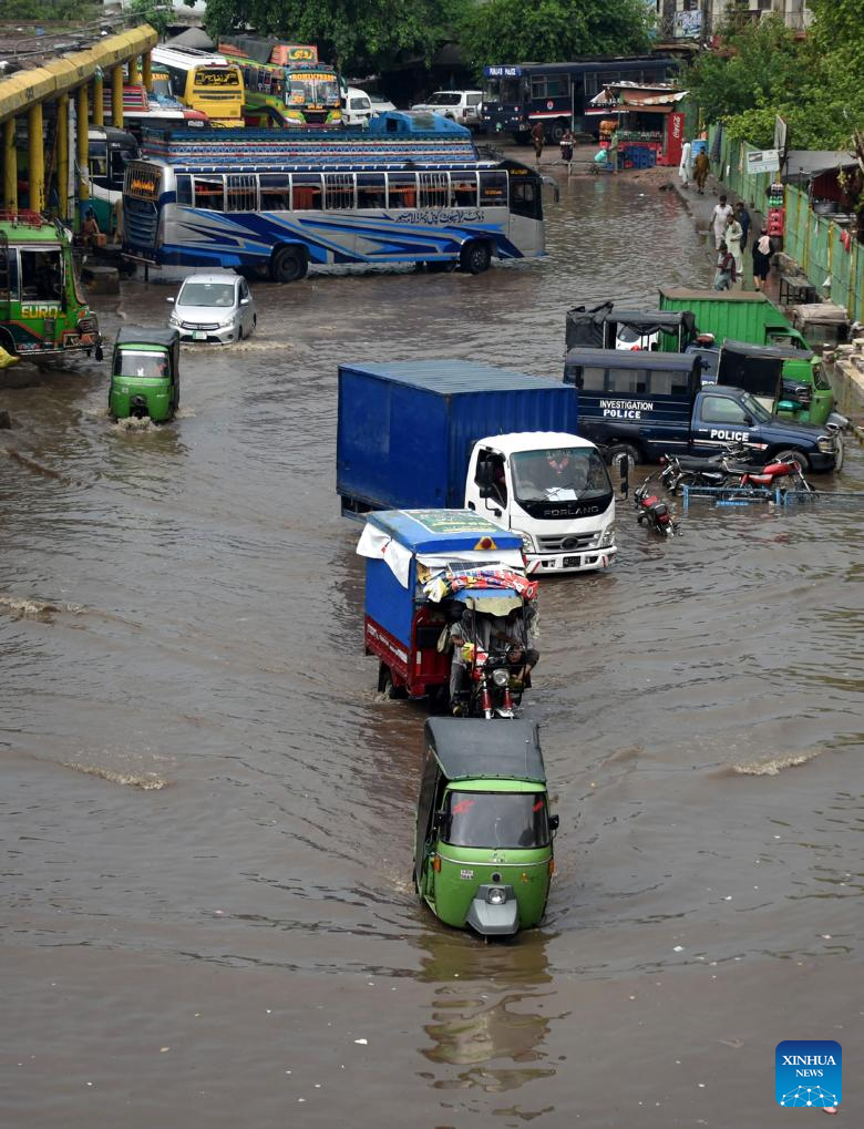 Vehicles wade through floodwater in a street after heavy monsoon rain in Lahore, Pakistan on July 9, 2025. (Photo by Sajjad/Xinhua)