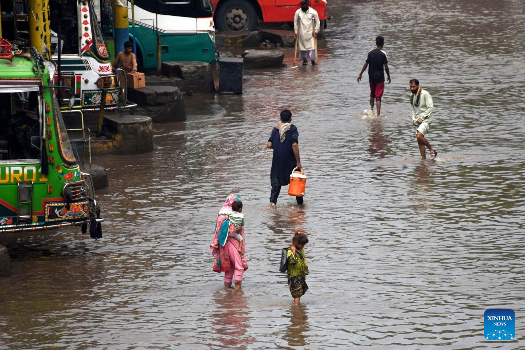 People wade through floodwater in a street after heavy monsoon rain in Lahore, Pakistan on July 9, 2025. (Photo by Sajjad/Xinhua)