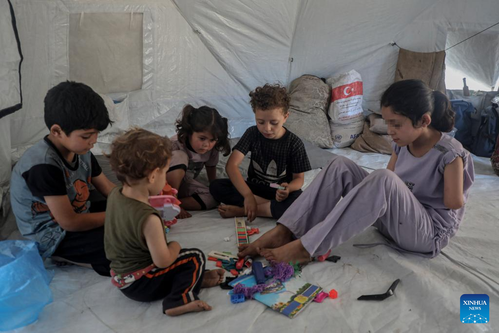 Sara al-Borsh plays with other children at her family tent in the Sheikh Radwan neighborhood in Gaza City, on June 29, 2025. (Photo by Rizek Abdeljawad/Xinhua)