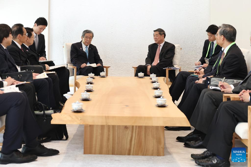 Chinese Vice Premier He Lifeng, also a member of the Political Bureau of the Communist Party of China Central Committee, holds friendly exchanges with Japan's Liberal Democratic Party Secretary-General Hiroshi Moriyama in Osaka, Japan, July 11, 2025. He on Friday attended China's National Pavilion Day at Expo 2025 Osaka and delivered a speech. (Xinhua/Jia Haocheng)