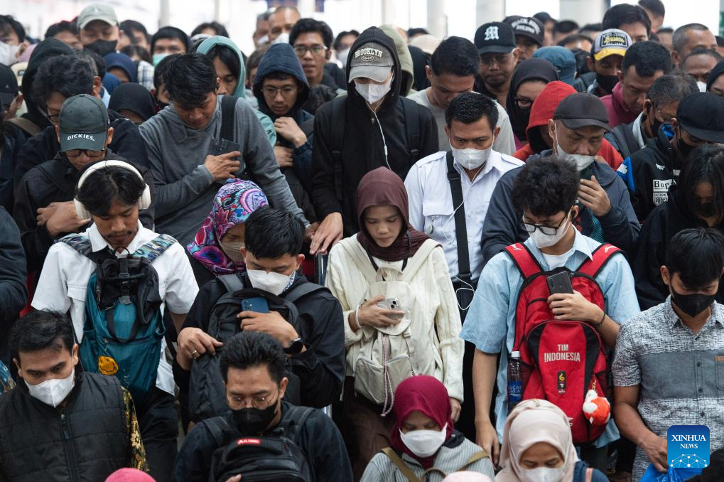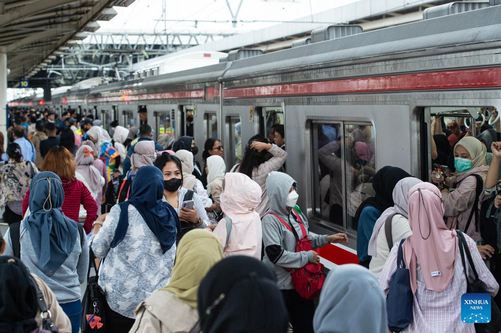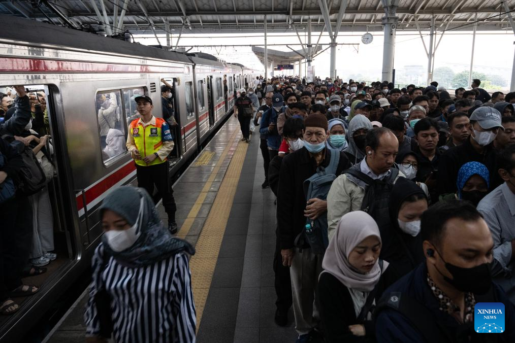 Commuters crowd the station platform during morning rush hour in Jakarta, Indonesia, on July 9, 2025. Indonesia is the world's fourth most populous country, with Jakarta being the most densely populated city in the country. (Xinhua/Veri Sanovri)